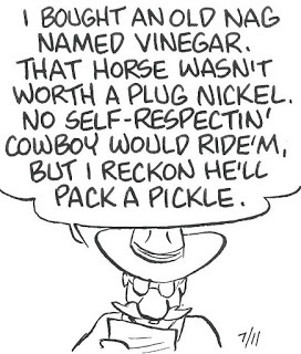 Last week I had the good fortune to once again attend the National Cowboy Poetry Gathering in Elko, Nevada. As usual, a good time was had by all. How could you go wrong reconnecting with old friends, meeting new ones, and sitting through hours (and hours and hours) of the best cowboy poetry and music the world has to offer? This year brought an unexpected and unusual treat. Fans of the “Pickles” comic strip know that on a few occasions, the curmudgeonly Earl Pickles has dipped his toes into the waters of cowboy poetry. As it happens, Brian Crane, the author and artist behind “Pickles,” is an old and dear friend and coworker and business partner. For some 40 years we have been close friends, if usually distant neighbors. When Earl was infected with poesy, I had the opportunity to work with Brian on some of his character’s poetic efforts.Brian came to his first Gathering with, of course, Earl in his pocket, to breathe the rarified air at cowboy poetry’s heights. Not only was it good to see and spend time with Brian again, I got a big kick introducing him to friends and enjoying their shock and surprise then smiles when I told them what he did to earn his daily bread, as so many of them are “Pickles” fans. (It often embarrassed Brian and he wished I wouldn’t brag on him, but he well knows I am not to be trusted.)I will be surprised if Earl’s poetic proclivities weren’t inspired by his time in Elko, and expect the funny papers will be seeing more of his versifying in the future.