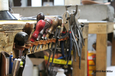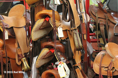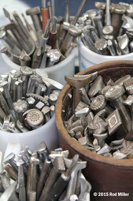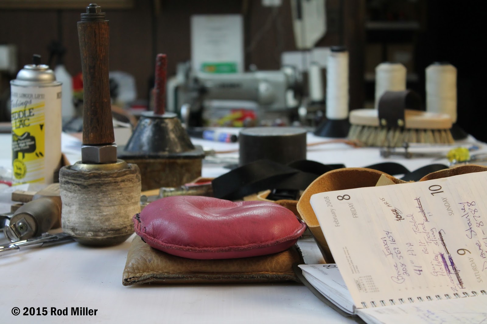 At work.Working with leather is a job, a craft, a skill, and an art. While doing stories on a couple of those artists I captured a few behind-the-scenes photos of some of the tools and materials the artists employ, ending with saddles for sale and an extreme close-up of a maker’s mark stamped into leather.