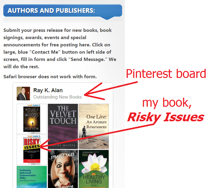 Risky Issues (my book) is currently being featured in the sidebar of the New Book Journal website, too. The books that are featured there are the last few books promoted on the site, and also on the Pinterest board called Outstanding New Books.