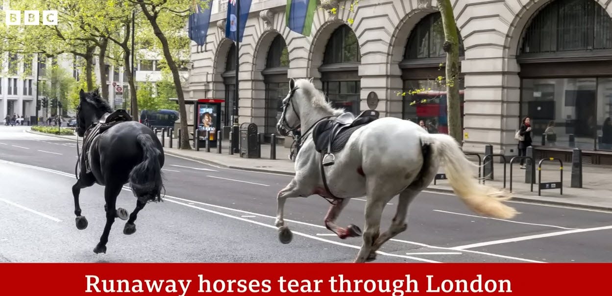 Exactly 25 days before Pentecost from April 24, 2024, FOUR riderless horses rampaged through the streets of London in what can only be a warning to those watching SIGNS. Two of these horses – a dappled GRAY with blood up to its bridle on his front and a BLACK horse is where the SIGNS ARE MOST SERIOUS.