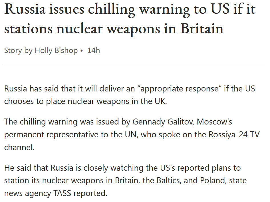 Russia warns that if NATO enters the war that Russia will have no choice but to use nuclear missiles, and warned that if America places nuclear missiles in UK it will have to respond as 4 Russian aircraft spotted off Alaska – Russia is always probing our air defense system – they know the West will not relent in pushing for WW3 and sooner or later the Bear must and will defend itself in a war that “no one wins”. Then we have the UN, the WEF and WHO all involved in a global power grab that prophecy says will happen. Watch for a big push for a “vaccine patch” filled with micro snake fang needles so small you don’t feel anything with you place it on your arm. Then we have earth changes with wild weather all over the world and more…