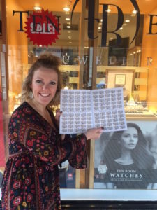 Beverly showing the illustration of 800 watches in Gutsy Girls in front of the current jewlery shop.