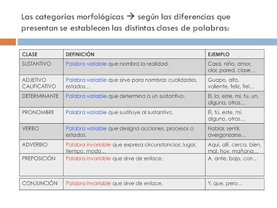 Y para terminar, escribe en el comentario cinco ejemplos de cada una de las siguientes clases de palabras: verbos, sustantivos, adjetivos, verbos, adverbios, preposiciones, conjunciones, y determinantes. (No valen los de la tabla gris).