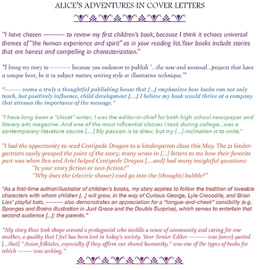 I think my cover letters did not make ME memorable. I’ve read articles about the lengths aspiring authors have gone to get their stories read by editors, but going to NYC and knocking on doors with cookies in hand isn’t always feasible, nor does it truly work. SO, if kindergartners, friends, strangers, book lovers, fellow aspiring authors and illustrators, librarians, and an independent bookstore owner have thus far had only good things to say about Centipede Dragon, where’s the disconnect between success and rejection? Anyone care to guess?