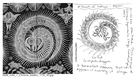Well, Centipede Dragon is NOT my creation, but the characterization of him is. The actual symbol came from the Miao (Hmong) Chinese ethnic group (see photo, left side of pic), who decorated their robes and banners with beautiful designs that intertwined or spiraled cows, birds, fish, centipedes and dragons. Centipede Dragon was one of the many symbols created to bring prosperity to their agrarian-based society.