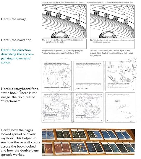 Storyboards are used in the film and TV industries and usually have three components: the narration (the manuscript), the sketch that shows what’s happening when that narration is heard, and the directives. Now, directives are an important distinction from a storyboard made for a book, because in movies and TV, there is the element of movement. So within the directives, you write out how the scene “comes onto” the screen, how it transitions to the next scene, you describe any movement occurring, any special effects; basically, you include anything visual that is happening during this chunk of narration.