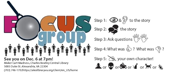 So, early in December (definitive date TBD), Charles Beatley Central Library in Alexandria, VA, will be kindly modifying one of their weekly evening events, Maker Cart Madness, to host me for a special “focus group” session for kids 8 years and older (but younger siblings are welcome so long as a parent attends with them). During this 1-hour event, I will read book 2 with the images, and get participants’ feedback. Then there will be an exercise on writing a story.