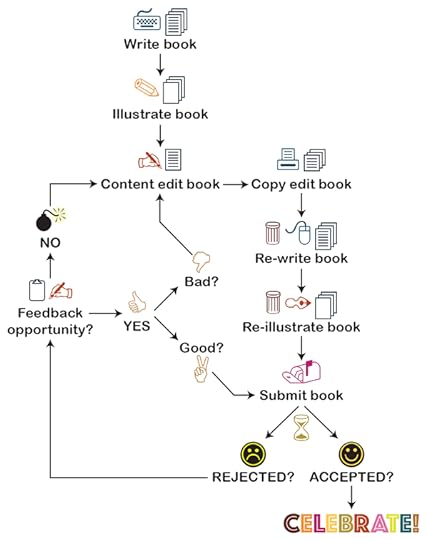 So, I created this visual flow chart to demonstrate the repetitive nature of this book publishing process. What the take home point is, is that re-editing content, re-copy-editing, re-writing and re-illustrating happens over and over as we creative persons try to assess what might not have been working with our manuscripts and illustrations, that garnered the latest rejection. Of course there are phenoms like Oliver Jeffers who send out to the top ten publishing companies and get the huge bite in the first round. I’m the first in line to acknowledge his genius in both storytelling and illustrating, but also to say that there are many other talented authors out there who frankly don’t experience this process in that way.