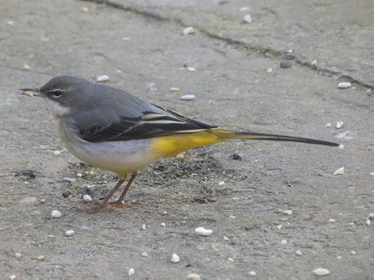 Lucy the leucistic House SparrowOf the pair of resident Robins, only one graced us with its presence, plumped out and very pleased with itself to be representing its redbreast posse. Maybe it thinks it is the most photogenic and coveted tick on the list, as it has recently been voted Britain’s favourite bird and always popular for its iconic place at the heart of the winter season. Two pairs of Dunnocks were omnipresent, as usual, not attracting attention to themselves, unassuming and modest little wind-up toys, ticking along under the hedge or on the lawn, dancing jerkily under their own momentum.The unexpected highlight for me, of this or indeed any recent BGBW, came just five minutes before the end of the appointed hour. Onto the patio bounced the Grey Wagtail, nicknamed ‘Cilla’ after its Latin name (Motacilla cinerea). She first appeared a couple of days ago for the very first time. Before that I had never seen a Grey Wagtail in the garden. I certainly wasn’t expecting her to put in an appearance for the hallowed hour. But she didn’t let me down. I even got a photo of her with a suet pellet in her beak (see above). Had to add her manually onto the BGBW results page online, as she wasn’t included among the species most likely to be seen.