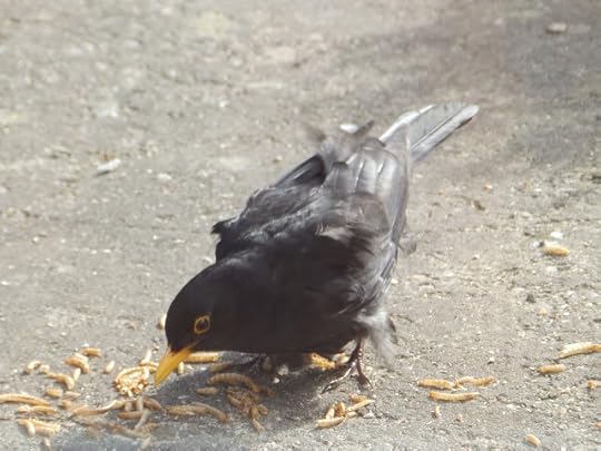 A wafer of ice has made sorbet of the bird's water dish and the bee-bath. I shatter it when I'm out scattering mealworms, filling feeders, dispensing lard and suet. Back up in my den I nudge the window wider. The chill's going to be worth it.