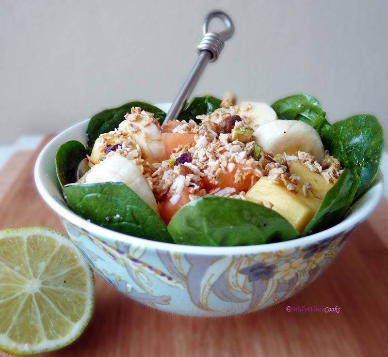 Salad with Warm Granola SprinkleIf you follow a gluten-free diet, breakfast might seem to be one of the most challenging meals to find tasty, easy ideas that meet your wheat-free dietary requirements. Ready in only 15 minutes, this Tropical Fruit Breakfast Salad with Warm Granola Sprinkle is also Dairy-Free and suitable for Vegans. This is a fruit salad but not as you know it, the dressed spinach leaves add a savoury twist. If you've not yet tried a breakfast salad yet, check out my Gluten Free & Wheat Free Diet Brunch & Breakfast Recipe Cookbook for more fabulous Breakfast Salad ideas.
