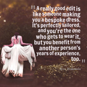 Erin: You will not be the only person who touches your work, and that’s a good thing. I used to be so insecure and competitive, but I’ve come to realize that a really good edit is like someone making you a bespoke dress. It’s perfectly tailored, and you’re the one who gets to wear it, but you benefit from another person’s years of experience, too.
