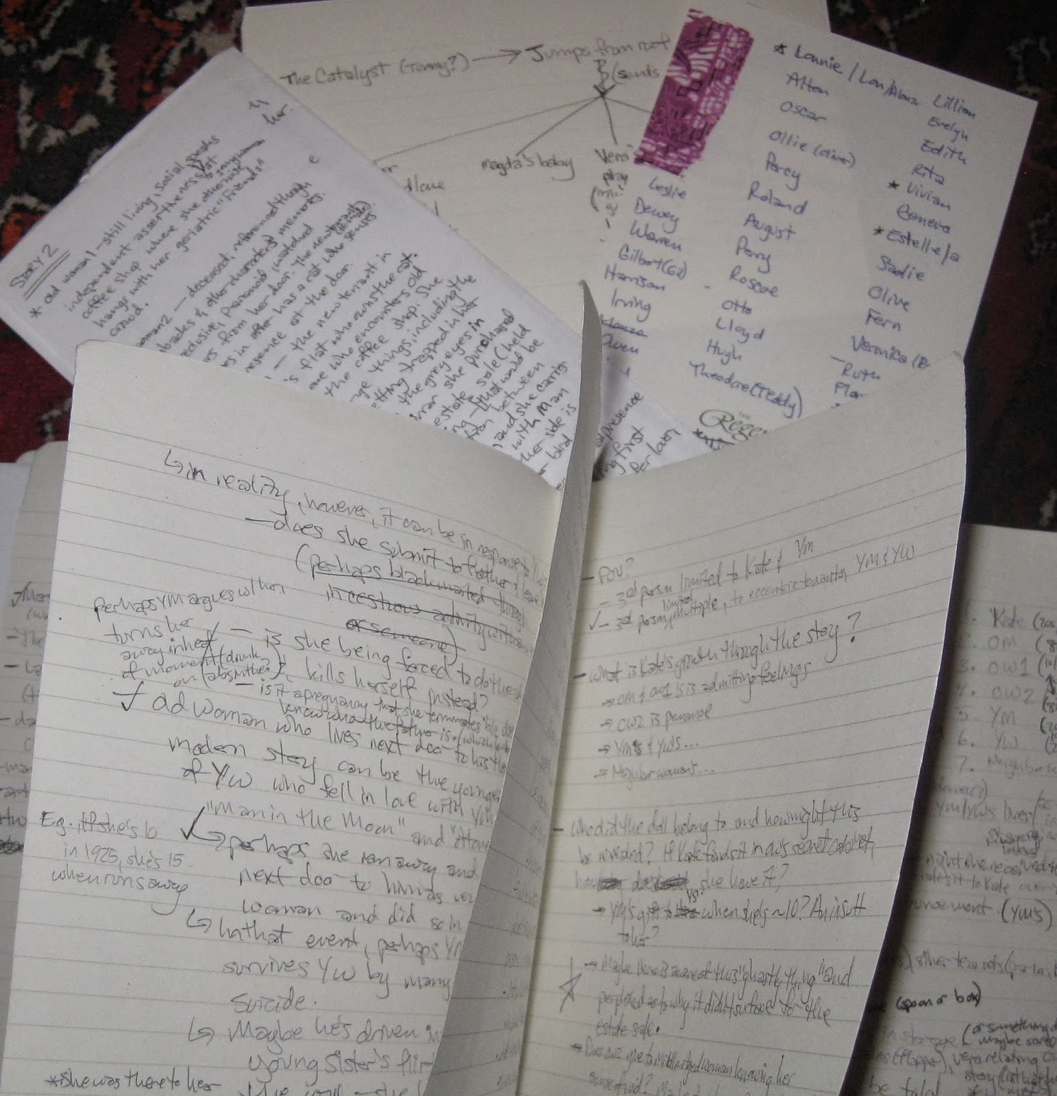 The photo above is where my novel Seven for a Secret was born: character profiles jotted on the back of my husband's resume at Cafe Nero in London, popular 1920s names listed on hotel stationary in Singapore, the catalyst and its ripple effect on different characters scratched onto a torn piece of paper who knows where, and the draft plot outline, key questions, and possible scenarios scribbled into a notebook at a cafe in the French Alps.