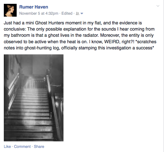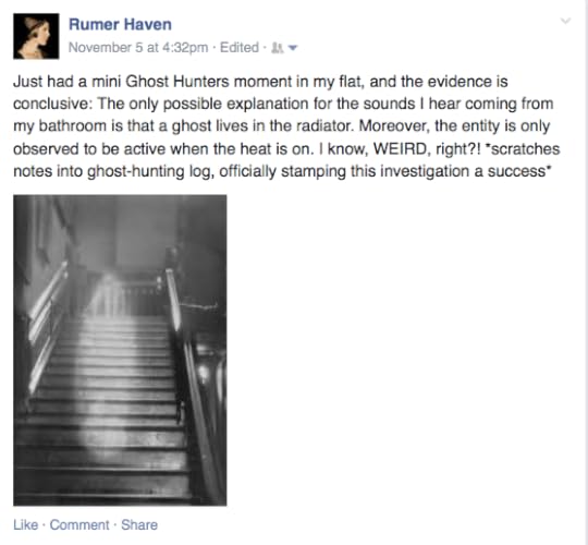 I know what you're thinking: drafty old cottage. Hey, I've seen enough Ghost Hunters to know to try to debunk this stuff! But this was also a newly renovated cottage with its hatches effectively buttoned up; everything's pretty well fitted, insulated, and air-tight. Nonetheless, we checked the area around the scarf for a draft, but there was nothing (and it would've taken a gust to reach it from the door--and just the one, as it didn't happen again--but it wasn't even windy outside), and there were radiators, not air vents blowing heat. Plus, nothing else hanging near the scarf had been disturbed. The few fringes that moved were almost selectively so.