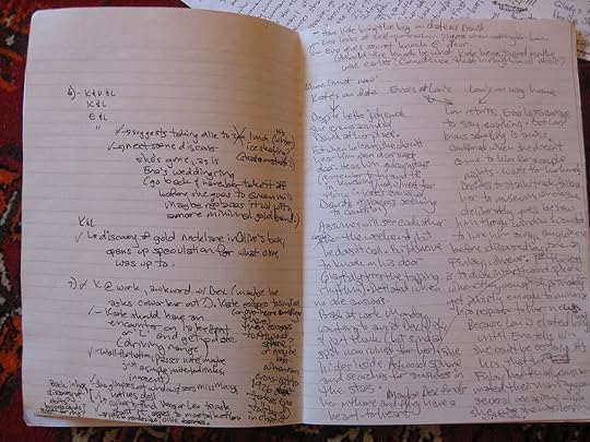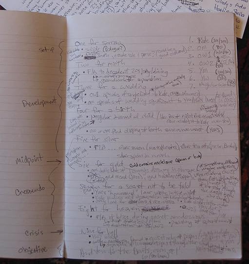 Which is what I did for Seven for a Secret . I gathered my miscellaneous brainstorming and started to slot it into sections. Taking a page out of Agatha Christie's book, who incorporated nursery rhymes into her plots several times, I decided to use the "One for Sorrow" rhyme (traditionally used to count magpies) as my story's structure. It both suited what I already wanted to write about as well as aspects I wasn't certain of yet, thereby helping shape some turning points. So this was essentially my outline. Still spastic scribblings in my journal, by no means neatly divided into tiers of A, B, C, i, ii, iii, but guidance nonetheless. This bullet-pointed bird's-eye view helped me tremendously by giving a sense of the story's shape and direction without also confining my creativity. I wasn't bound to every idea that I jotted down here, nor were any of them fleshed out enough to dictate every step of the journey. Some writers might prefer a more detailed outline than this, but I've found I personally thrive under this balance between the concrete and the as-yet abstract. The organized and the organic. That gives me the breathing room I need to let myself change my mind if the characters want to head somewhere else, and it allows for those moments of magic when, truly and almost inexplicably inspired, you just write without knowing where it's going and end up creating something better than you could've ever achieved if you'd thought about it too hard.