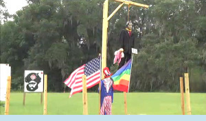 Gainesville, Florida – President Barack Obama hangs in effigy from a gallows with a gay flag in his hand in the front yard of a Florida church in a blatant grab for publicity–but Pastor Terry Jones is flirting with incitement to violence against blacks and gay people. The Smoking Gun blog says that the Obama effigy is also holding a baby doll in its other hand. A trailer emblazoned with the motto, “Obama is Killing America” sits facing the road in front of the Dove World Outreach Center. In an interview with Huffington Post, Jones said that the flag was to protest the President’s support for LGBTQ people, and the doll symbolized Mr. Obama’s position “on abortion.” As USA Today reported, Jones came to international attention for his “Burn a Koran” campaign in 2010 and 2011 which inflamed anti-Muslim sentiment in the U.S., imperiled the lives of American service members stationed around the world, and ignited Islamic protests against this nation throughout the world. After Jones oversaw the burning of the Muslim holy book in 2011, three days of riots broke out in Afghanistan, with over 21 homicides including seven dead United Nations workers. Now, seeking the glory days of his past buffoonery, Jones is making a visual statement he says is protected by the First Amendment guaranteeing freedom of speech.