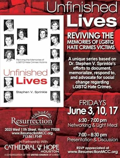 Houston, Texas – Reviving the memories of LGBTQ hate crimes murder victims will be the focus of three Gay Pride Month events sponsored by two gay-predominant churches and a national transgender organization in the Houston metropolitan area during June. Dr. Stephen Sprinkle, author of the ground-breaking book, Unfinished Lives, will present three programs on ways anti-gay hate violence must matter to everyone. Resurrection Metropolitan Community Church, the largest-membership MCC in the world, and Cathedral of Hope Houston, a United Church of Christ congregation planted by CoH Dallas, the world's largest gay congregation, and the Transgender Foundation of America are the sponsors for this series. All events (June 3, 10, and 17) are open to the public free of charge and will be held on the campus of Resurrection MCC, 2025 West 1tth Street, Houston, Texas 77008, beginning each evening with a light meal at 6:30 p.m. Copies of his book will be on hand for purchase and signing by the author.