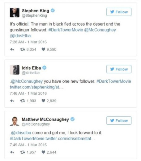 I think I’m even more excited about the fact Matthew McConaughey will be playing the Man In Black! If you’re a Stephen King fan you know the Man In Black is ‘the’ villain, who appears in various forms in many of Stephen King’s works. I couldn’t think of a better actor (sorry, Jamey Sheridan). I’m pretty happy with the casting. And this series of tweets made my fangirl heart scream in delight:
