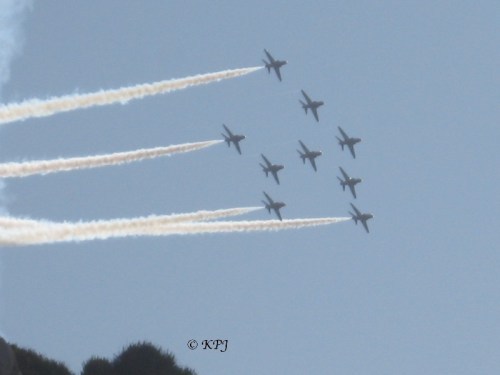 So there I sat, at the end of the queue, in my car. I leaned back looking up at the blue sky I saw, where other’s saw the deadness of their car’s upholstered roof. An aeroplane flew across and directly above me. As I watched, it began to blow out smoke – not yeek-my-engine’s-failing-and-I’m-about-to-plummet-out-of-the-sky-type smoke you understand – stunt plane smoke like the Red Arrows (or les Bleu, I don’t have a picture of the red arrows) blow out in red white and blue. Anyway, I watched and as it flew, smoke in full er… puff? It drew a circle. Then after a bit of flying back and forth, it put two eyes inside the circle and a smily mouth. Then it flew away. What I liked about that was the fact that the pilot must have known that hardly anyone would see what s/he did but they went and did it anyway.