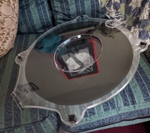 It arrived in a huge box and since I was buying the hat I also bought a thing that looks like a clear plastic loo seat which keeps it flat and in shape … see below.