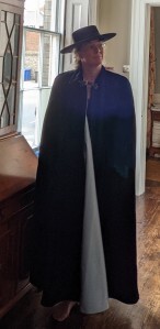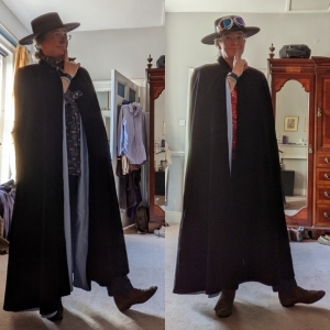 That left The Pan of Hamgee. He is my favourite character, except when I prefer one of the others, because they’re like kids. It’s hard to pick one. He also wears a hat, which is nice and distinctive; a cross between a Mel and Kim hat and a Zorro hat. Like Zorro he also wears a cloak, but it’s ankle length—unlike 1960s Zorro … although, did the Antonio Banderas version have a long cloak? Maybe he did. I can’t remember, anyway, onwards. The Pan wears a velvet jacket—I’m thinking the kind of gothic brass buttoned number you might have seen on members of Pink Floyd in the 1960s—and obviously the canvas jeans and elastic-sided boots. How much of this shizz do I have? Oh look! Everything except the hat!