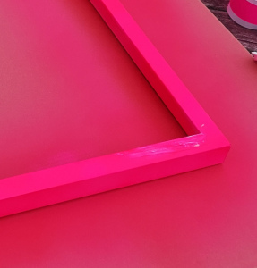 Never mind. I’d just nip up to Halfords for more. I was knackered now and my knee was a bit swollen. Too swollen to get into my car so I decided I’d cycle up there, which I did and grabbed a second can of pink paint. Back home I began to apply paint to the disaster area. I didn’t think it was going to work but it matched better and better as each coat dried until finally, three quarters into the second can, I was left with a uniform expanse of fluorescent pink. Yes. After leaving it half an hour to dry it was time to put the glass back in.