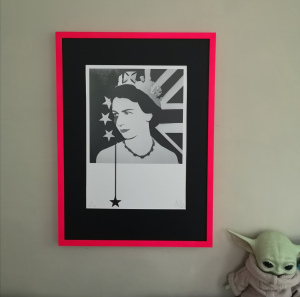 Baby Yoda. He likes this too.How could I be such an absolute wanker? Seriously though, what a complete fucking arse! Does my cockwomblery know no bounds? Mwahahaahrgh! Jeez, clearly not. Once I’d finished mashing my forehead against an empty part of the table I set about clearing up the broken glass, with the help of a very sympathetic McOther. Since there was no glass to put into the frame, I put everything else in. I was happy to leave it without glass for the time being. I was happy with no glass in it full-stop, to be honest, but … dust, thunder bugs, air full of brown smeal from the road and countless other shit so, no. Sure, it looked good, but glass-free was almost certainly bad from a preservation point of view.