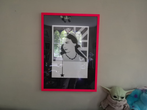 Now there is ‘glass’. It was the wrong light to take this photo … dark basically so the window reflections are horrendous but … you get the gist, I’m sure.Maybe I should buy a clip frame? Yes. That’s what I’d do. Buy a clip frame and use the glass from that. Once again I turned to my friend, Monsieur Google. Nearest one £8.99 from Dunelm. Right then. I leapt into McOther’s car because 50×70 plus protective packaging isn’t going to fit into my boot, and headed off. Twenty minutes later I was the proud owner of a clip frame with a very and I meant very thin piece of perspex over it. Never mind it would have to do. I disassembled my recently assembled print and put the perspex into the frame where the glass should have been. It was a bit flimsy but at least it fitted. So far so good.