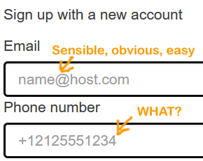 Because it’s always a pain in the arse, I had this great idea, I would set up an account. First they needed my email address and they helpfully gave me guidance in the box name@host.com how simple is that? Brilliant. Then comes the phone number box and what do they put? This: +12125551234