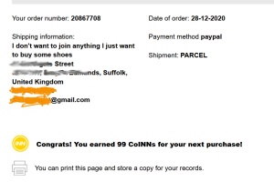 Further news, I decided to buy myself a pair of spiffy new boots this week. I duly searched for them on line and, finally, discovered a pair in a colour I like and a size that would fit. Joy. As usual when I came to buy them the ruddy site wanted me to join. I get so fed up with this having to join up to everything. Yet more emails I don’t want and another password for an ‘account’ I’m unlikely to use ever again; a password I am even less likely to remember. The worm turned and I gave my address but wrote my feelings in the name box. I paid by paypal so they’d be using those details anyway. Right?