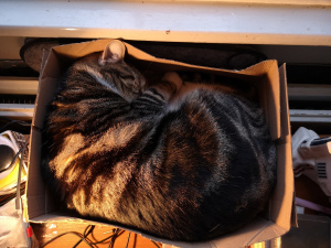 AfterThen, yesterday, McCat appeared at ten to five by alighting beside me on the desk with the lightness of a frozen checking that had been fired from a cannon hitting a wall. I rubbed his ears a bit and then patted the bottom of the box. He does understand the phrase, ‘get in your box,’ but tends to go to the one on the floor so rather than say anything, I just kept patting it and pointing. He got the message and climbed in.