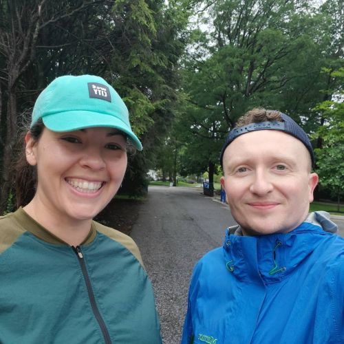 Wet, windy, and cold runs at 7x1min at 8:50ish pace and 5x1 min at 7:10ish pace. Fitness friends high five, Drea.