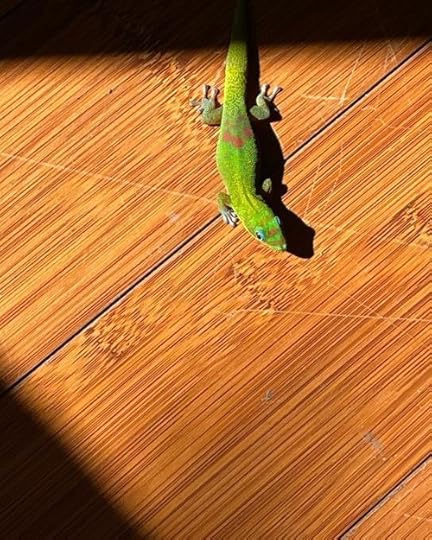 A Big Island gecko bid us adieu and big, sandy beach welcome us...