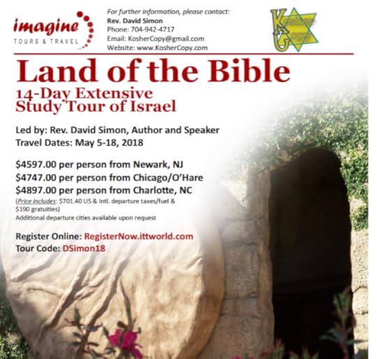 Visit our website www.KosherCopy.com for detailsOur trip to Israel will be comprehensive. We will journey throughout the land and visit each region. You will discover differences in terrain and how lives of people in the Bible were impacted by where they lived, the places they traveled and through the people they met.