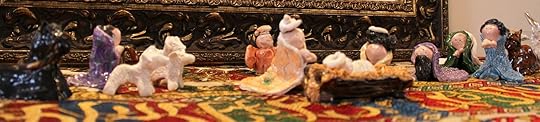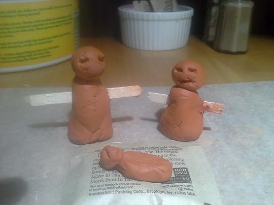 I decided to give the Kindergarten children in my class a gift. I bought air-dry clay and took it to breakfast this morning, where I practiced (and got it right the first time!) One pinch of clay rolled between my fingers to make the head. Three pinches of clay shaped like a bell to make the body. A coffee stirrer (I will use toothpicks in class) for the arms, and another pinch made the body and head for the baby. I cut small mangers out of pressed wood (looks like hay), and will put it in a box for a stable.