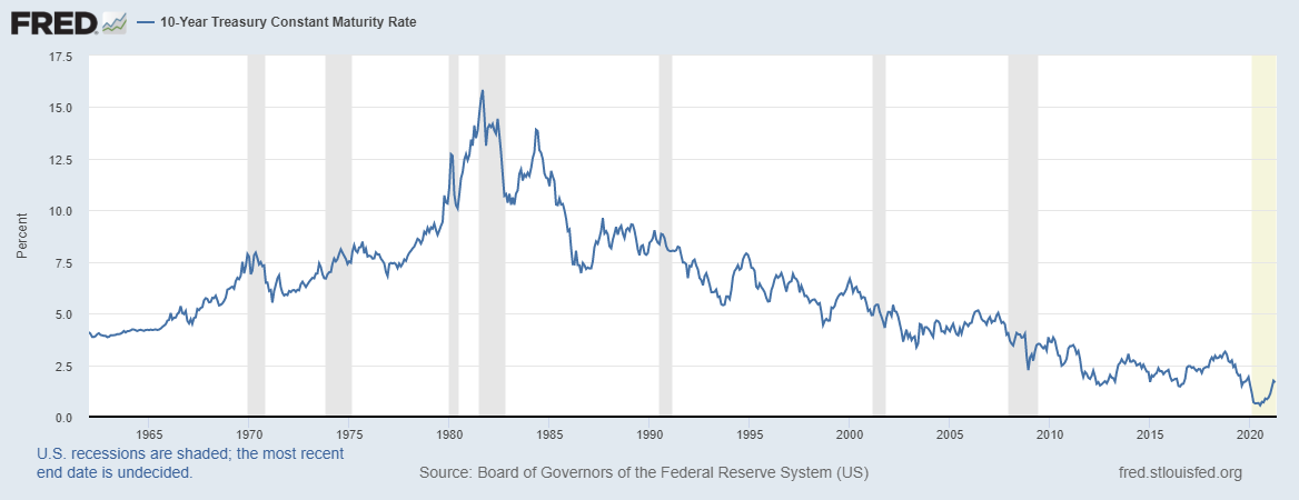 After thinking this through, while there is definitely a short term threat of inflation, longer term it's not totally clear to me that we don't face an equivalent risk of deflation as stimulus wears off, supply chains normalize and technological innovation continues to increase efficiency and puts pressure on the labor market (both in terms of overall demand and also labor rates). One of the long term consequences of the COVID-19 pandemic is the acceleration of corporate investments in technology to streamline process and leverage artificial intelligence and automation, which ultimately results in substitution of technology for labor. As such, many jobs cut during the pandemic recession just won't be coming back. If high unemployment is persistent, that will be a significant drag on economic growth. At the same time, new jobs are forming rapidly as technology innovates, but there will be fewer of those and they will require different education and skills. Either way, the Fed will have no choice but to keep short term rates low until labor markets recover and this could take quite some time. This means cash will continue to offer no return and thus forcing investors into stocks, commodities, bonds and other assets.