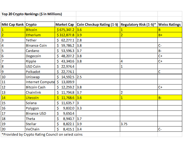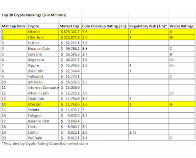For this week's post, I have updated my Top 20 Crypto Rankings, since it has been a while since the last update back in November 2020 and a lot has changed in the space since then. I was able to get Coin Checkup ratings on most of the coins, Weiss Ratings on about half and I discovered a new rating of securities regulatory risk published by the Crypto Rating Council on some select coins that I thought was interesting. A higher score on a scale of 1 to 5 reflects greater securities regulation risk. Overall, Bitcoin and Etherium continue to be the dominant coins as they were in the last update. Bitcoin's market cap has increased by $339.1 Billion or 100% since the last update six months ago and Etherium's market cap has increased by $249.8 Billion or 396% since the last update. This is pretty incredible considering the recent massive (50%) market correction and all the related negative press around it. The cryptocurrency market is rapidly changing and adoption is growing, with new developments literally every week and so it's quite a challenge to keep up with it all. One of my favorite YouTube channels for updates in the space is Blockworks and I recommend you check it out if you're interested, especially the weekly show On The Margin, which is always informative and entertaining. Also big news this week was the Bitcoin Conference in Miami and while there were some shenanigans, the overall content, tone and guest speakers were incredible, the news about El Salvator planning to make Bitcoin a recognized currency was huge and I believe there is a lot to be excited about for the future of Bitcoin and cryptocurrency space generally.