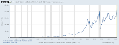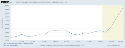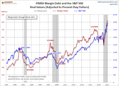 Last week showed just how great corporate earnings were, with a vast majority of the S&P 500 beating estimates significantly so far this earnings season. The "low base effect" of being for the most part completely shut down last year for most companies contributed greatly to year over year growth, but analysts still got it wrong. The stock market reaction in many cases was muted and many companies who otherwise reported excellent results and outlook sold off. This will no doubt create some near term buying opportunities for great companies including Microsoft and Apple. At the same time, the bond market sell off abated somewhat and rates stabilized (for example 10 year most recently at around 1.625%). Could the markets be telling us that while we will see stellar near term growth and higher than normal inflation, the outlook for future growth - 2023 and beyond is anemic, possibly deflationary? Will we see continued strong growth for years to come with higher than normal inflation? Or will we see weak or no growth and inflation (stagflation)? The first scenario seems like the market signal, versus the other two. With the stock market continuing to make all time highs, one concern weighing on investors' minds is the large amount of margin debt that has been taken on (an all time high), as shown in the chart below: