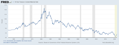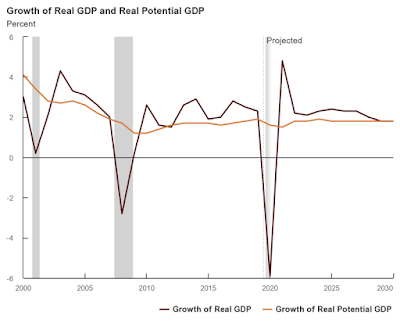 While this is a significant short term increase of 110 bps in a period of 9 months, it's not particularly rapid in historical context and we are still very close to all time lows for this important benchmark rate. For example, in July 1979 the rate was 9.01% and by April 1980 it had risen to 10.76%, a 175 bps increase in 9 months. We know in hindsight that period coincided with serious and pervasive inflation, which is why the rates were so much higher and now we are starting from a much lower level, having been through a period of very modest inflation. If the bond market is processing all available information correctly, it is not seeing economic growth (the main driver of long term inflation) continuing at the current pace for very long and indeed, falling to perhaps lower than pre-pandemic levels. Indeed, the CBO projection shows GDP trending back to about 2% over the next several years, as shown in the chart below. The Conference Board projects 6% GDP growth in 2021 and 3.5% GDP growth in 2022 after posting -3.5% in 2020. The huge amount of fiscal and monetary stimulus that was deployed last year and earlier this year (and more to come) is clearly driving the economic recovery. All of this designed to "prime the pump." But what happens when the stimulus effects burn off? Will the pump run on its own? Will we return to 2% growth or will it be even lower?