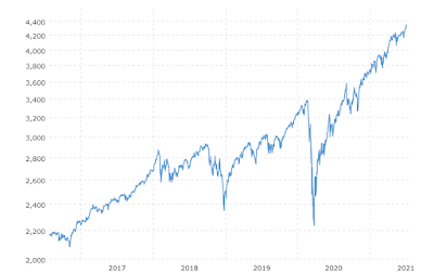 After reviewing the market action last week and watching some good market commentary on YouTube (see my twitter feed for some of the recommended videos I posted), my overall portfolio positioning as discussed last week here is still pretty solid and poised to weather the ups and downs as the markets cycle between risk on and risk off, inflation and deflation, etc. While Bitcoin and other crypto has been struggling lately, I am still bullish for the long term outlook on this asset class and feel better about reducing my allocation last week and shifting some money to gold, silver and TIPS. For my stock trading portfolio, I'm making a few moves next week to capture some areas of the market that I think look poised for growth and exit some positions that look less attractive, which I'll talk about later in this post. In my opinion, the biggest macro theme in the coming weeks, other than inflation, is how over-extended the US stock market is starting to look. The S&P 500 continues to post all time highs and the chart is starting to look parabolic - a troubling development, as shown in the chart below: