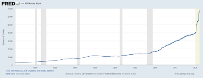 With persistent inflation however, bond yields would eventually climb to a level that would attract more investors away from stocks and looking for "safety." Some have said that could happen when the 10 year Treasury approaches 2.5% or 3%, (assuming no Fed intervention) which would also put a damper on economic activity, including housing and autos which have been leading the recovery so far. In past periods of high inflation (i.e., the 1970's), the stock market traded flat, while commodities performed really well. As I have written previously, we have seen an unprecedented growth in the money supply due to the Fed cutting rates and buying bonds - about $5.7 Trillion committed. The money supply curve has gone parabolic (see chart below).