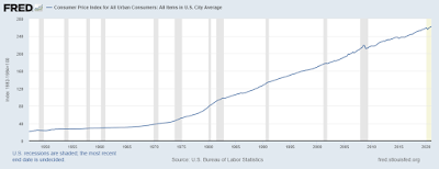 Inflation as expressed by the Consumer Price Index continues to look tame as shown in the chart below, showing a 1.4% increase in January 2021 vs a year ago, but of course the long term perspective is that purchasing power of the dollar is eroding steadily over time. You can also see the big increase in inflation during the 1970's on this chart where the price index doubled from 40 to 80 or 100%: