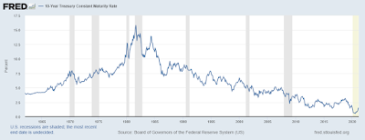After shrinking my portfolio's bond exposure last week to about 12.5% (short term Treasury Inflation Protected Securities exposure via the VTIP ETF), I received more confirming evidence this week that the move out of longer term, non-inflation adjusted bonds was a sound strategic shift. Bond yields have declined steadily since peaking in 1981 (at that time the 10 year Treasury bond was yielding almost 16%!) and hit a low in 2020 of about 0.6%, a rate decline of about 96%. Rates have been rising recently as high as 1.5% and seem certain to head higher as the economy recovers and in particular if investors anticipate higher inflation. What's got investors spooked is how rapidly the rates have been rising recently. Here's the long term chart of the 10 year bond yield: