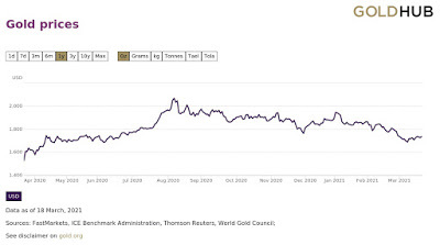 Gold has been in a down trend since hitting a high back in August 2020 at $2,038 per ounce and has mostly been trading sideways in a range between $1,750 and $1,850 per ounce over the past six months (see long term chart below). Recent volatility in the bond market with long term interest rates spiking has caused more downward pressure on gold, hitting a low of $1,685 on March 8, from which it has bounced back up to around $1,739. Many investors believe gold has been consolidating since August and will eventually begin a steady move up, driven by massive fiscal and monetary stimulus in the US which is expected to cause inflation (and possibly a rotation from stocks and bonds into commodities). As I have written about before, a Financial Fortress comprised of a diversified portfolio should include an allocation to precious metals, including gold and silver.