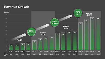 For those are old enough to remember Siebel Systems (the granddaddy of CRM) in the 1990's, you will know the founder Tom Siebel who has a strong track record in the technology industry dating back to his early involvement in Oracle. He later sold Siebel to Oracle after building a $2B business. Well, he has been at it again, this time quietly building over the past 11 years a company called C3.ai. This company provides a customizable layer of AI decision support tools that is database platform-independent and can combine large amounts of data both inside and outside the enterprise to support decision making. He has some great partnerships, including Microsoft, and has seen tremendous revenue growth as shown in the chart below: