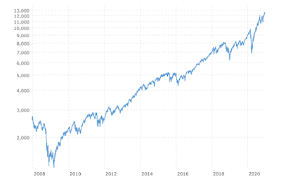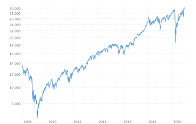 With the end of 2020 thankfully coming into view, I thought it would be good to review different asset classes, their relative recent performance and evaluate portfolio strategy heading into 2021. One theme that is consistent is that asset prices have seen tremendous inflation recently, and no asset class has been spared. There have been many drivers to this, including expansive monetary and fiscal policy in response to the COVID-19 pandemic and a nascent economic recovery. Finding value has become increasingly difficult, which is why in the stock market for example, many analysts are saying it's a "stock picker's" market. Bitcoin, gold/silver and bonds have also enjoyed a good run this year and with low interest rates, residential real estate is starting to see some strong price appreciation (about 7% year to date nationally, which is quite a bit higher than the 10 year average of about 5%). The stock market continues to reach new highs on a daily basis as shown in the charts below for the S&P 500, Dow Jones Industrial Average and NASDAQ: