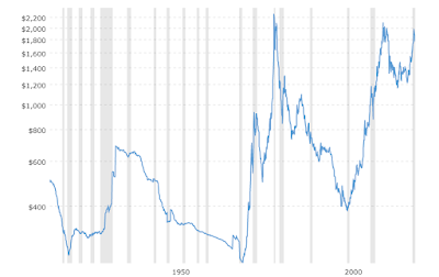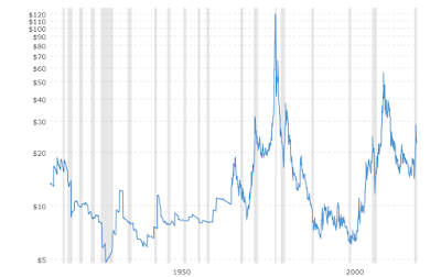 Silver is currently nowhere near recent peak despite the macro trends mentioned above. Here's the long-term silver chart (note where the prices peaked at over $100 and $50 only to fall precipitously thereafter):