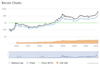 Over the past few months as I have continued my Bitcoin research, I have decided to increase my recommended allocation from 2-3% to 5-6% of a diversified portfolio. I post relevant videos and other content on my Twitter @NickReichert if you're interested in following and I also post links to my recent blog posts there as well. This recommended allocation increase is driven by the following:Excellent recent performance of Bitcoin (300% increase over past 12 months) and great long term growth potential as discussed in more detail belowGrowing adoption as the first global, decentralized monetary networkMonetary and fiscal stimulus measures that governments around the world are taking in response to the COVID pandemic to "print money" that will continue for the foreseeable future. Below is a long-term logarithmic chart that shows the steady, yet volatile, growth of Bitcoin market cap, price and volume. I like to look at the log charts because they are more helpful in visualizing the long term trend and smooth out a lot of the short term volatility, which shouldn't matter to a buy and hold investor: