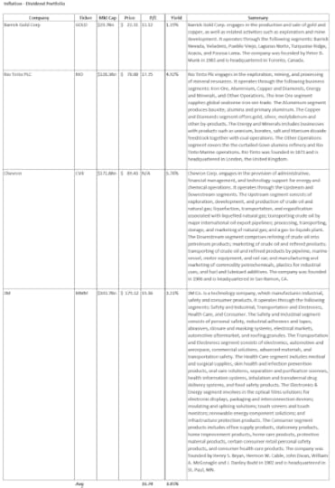 This portfolio gives exposure to gold and copper (Barrick Gold), basic materials (Rio Tinto), oil (Chevron) and industrial manufacturing (3M). All of these areas look to grow significantly as the economy recovers, will benefit from the "value rotation" and could really take off if there is meaningful inflation in the coming years, all while paying a nice dividend yield. The table below summarizes the market cap, recent price, price earnings ratio and dividend yield as well as a brief summary of the business.