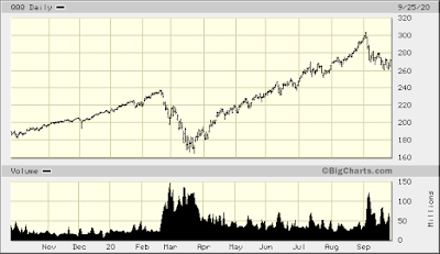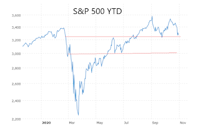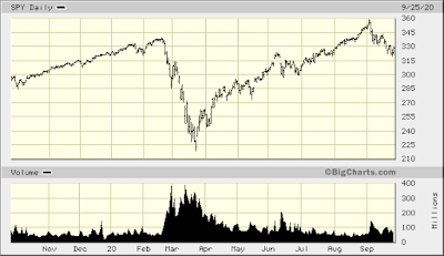 The next several weeks promise plenty of news and market volatility, with numerous issues / uncertainties on investors' minds including:US Presidential election outcome Lack of a new stimulus bill out of Congress (highly unlikely prior to the election, even though some lawmakers are still holding out hope of a deal - this also seems even more unlikely given the Democratic uproar over the President's Supreme Court nominee, the confirmation of which is to be completed before the election)Course of the COVID-19 pandemic as we move into the winter in the US and as other countries in the world begin to see a resurgence and some countries are forced to take lockdown measures againPersistently high unemployment (rate of improvement has slowed over the past several weeks)Sluggish economic recovery Continued flow of IPO's (9 next week) which causes investors to sell other stocks (mostly tech stocks) to buy, which can drive down the market if selling is concentrated in the FAANG group as we have seen with the recent market pull-backSome analysts are predicting more volatility in the coming weeks and perhaps some further declines in the major stock market indices as stocks sell off due to the numerous uncertainties. However, once we are past the election and more fiscal stimulus is available, the markets are expected to stabilize and continue to march higher with the economic recovery, perhaps led by sectors that have lagged in the most recent runup including "traditional" cyclical stocks such as industrial / material companies. The S&P 500 (SPY) shows a very noticeable break from the rising trend since the March lows (see chart below). This could be an indication that a further decline can be expected before the selling is done, possibly as much as another 10% to 20% downside, according to some analysts. Considering how much and how quickly the markets have recovered from the March lows, that would not be surprising.